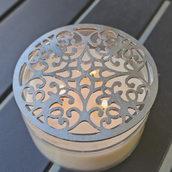 These Metal Candle Toppers will add both style and function to your jar candles! Simply place the stylish, thick, flat metal art on top of your candle after lighting it (but remember to let it cool before removing!). Not only do they look fantastic, but they also help your candle melt the wax all the way to the outer edges. Allow your candle to burn long enough to melt the wax across the full surface, and the topper will help even out candles that have started to burn into a core down the wick.